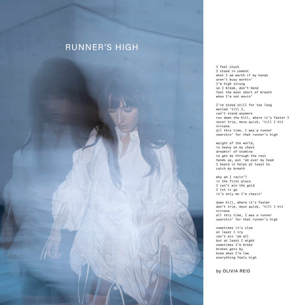 Olivia: This song is a bit more collaborative in the production than some of my earlier releases that I produced alone. An early iteration of the instrumental track was actually sent to me via Instagram by co-producers Ry Jones and Bastian Testori. Ryan shared the idea with me, highlighting this beautiful luscious saxophone outro they had made, which they said was inspired partially by the first single I had put out back in 2018 called “Organic Bloom.” When I heard the early version of the instrumentation, I was so inspired. The instrumentation really felt like me, and I immediately asked if they wanted to collaborate on it. The lyrical and melodic concept for ‘Runner’s High’ came so quickly to me. I’m so grateful that Ry sent that Instagram message, and it was such an organic creative process to bring the final version of the song together.